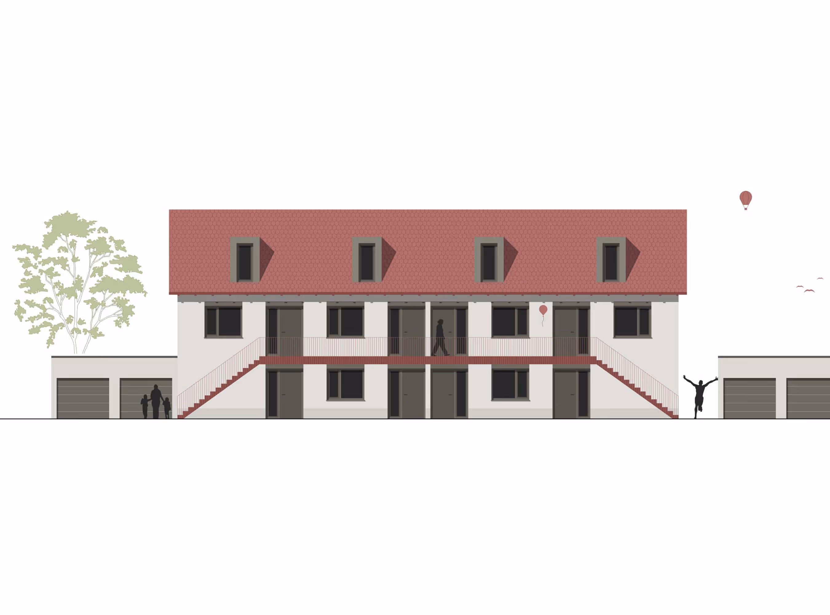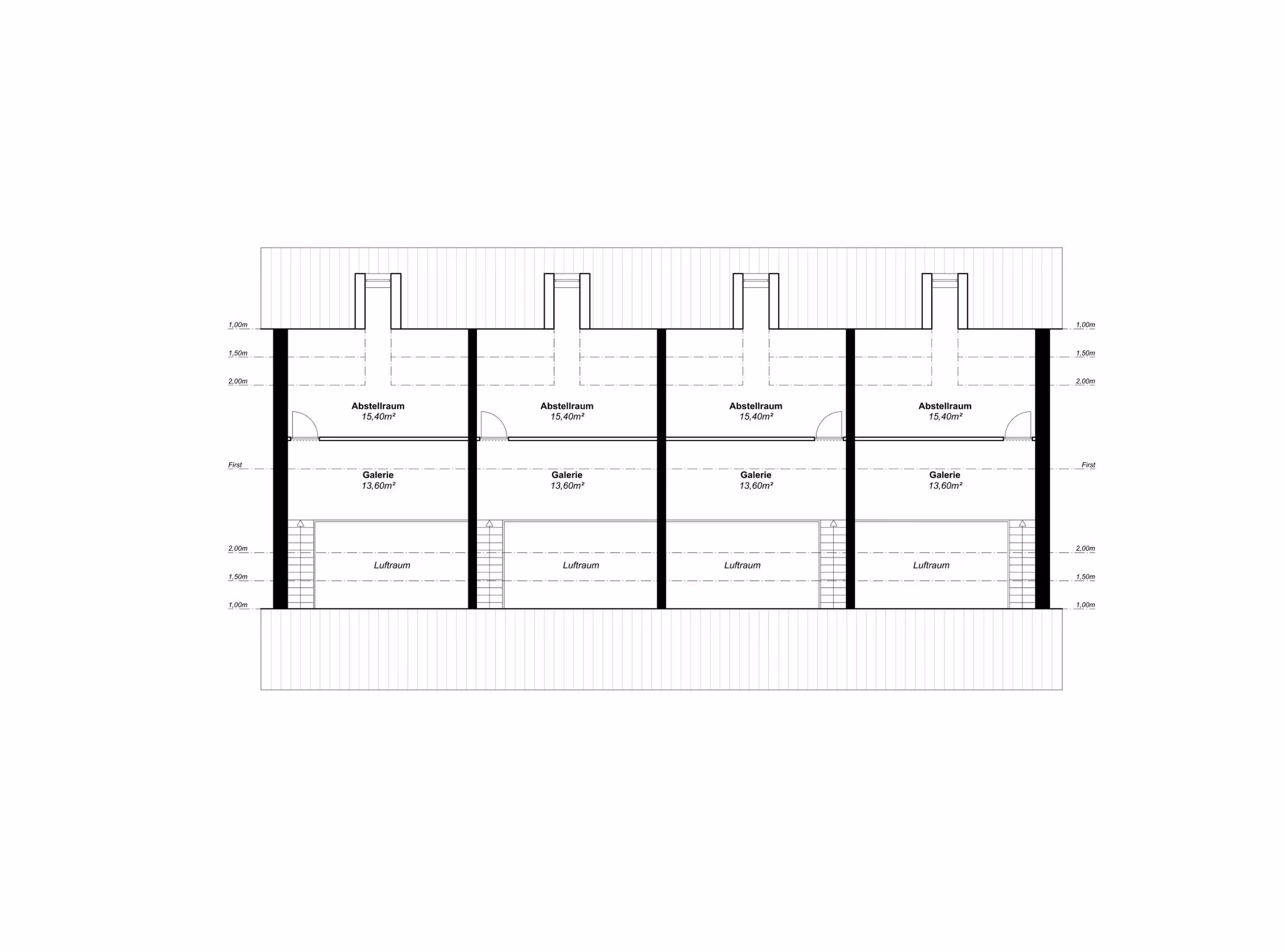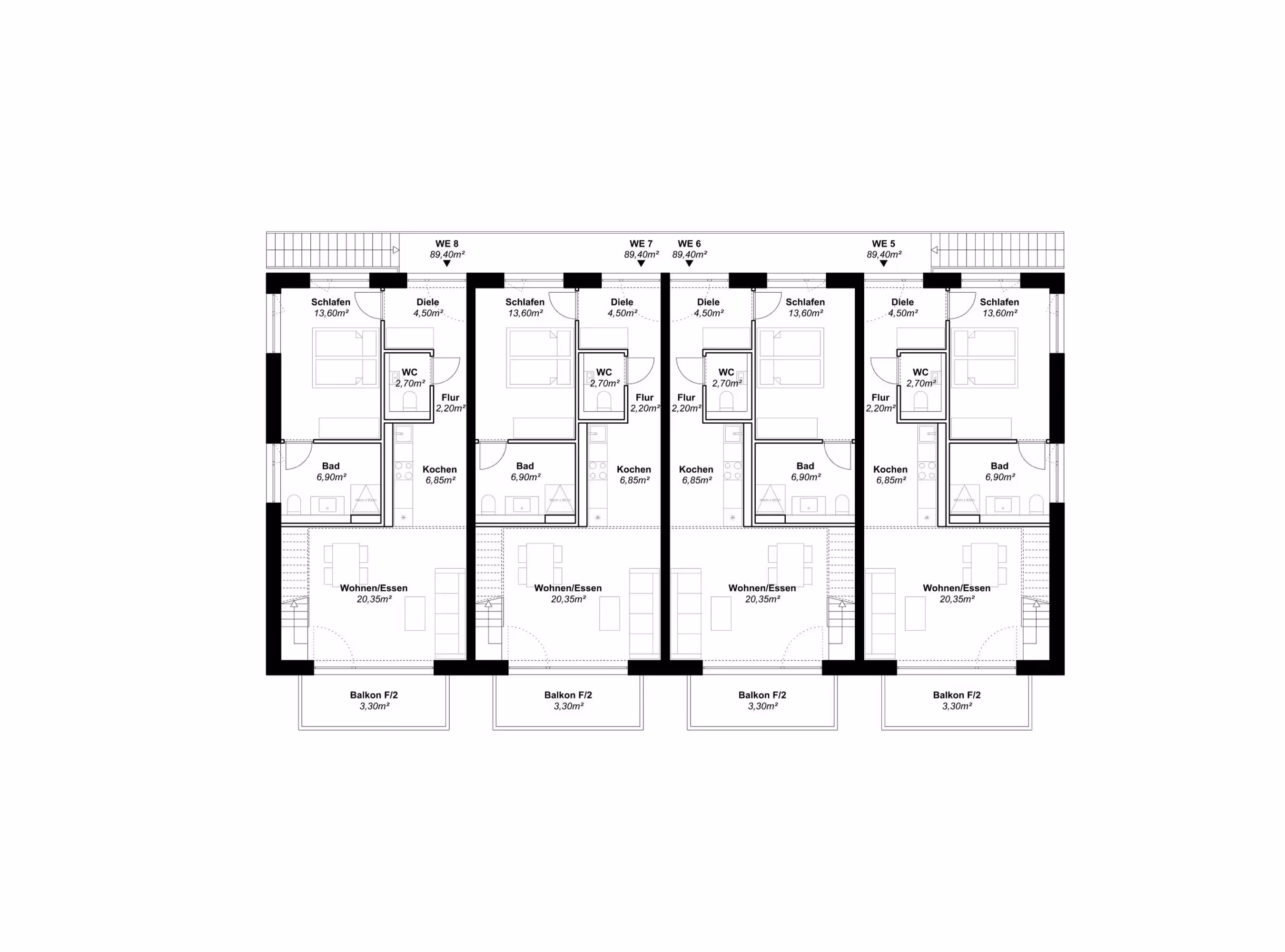 Auf der oberen Etage und im Dachgeschoss befinden sich vier Drei-Zimmer-Maisonette-Wohnungen mit jeweils 89,40 m². Diese beinhalten ein Bad, ein separates WC, eine Abstellkammer sowie eine ansprechende Galerie im Dachgeschoss. Eine interne Treppe führt vom Wohnzimmer ins Dachgeschoss, und der große Südbalkon bietet einen herrlichen Ausblick. Die Wohnungen werden über einen offenen Laubengang im Norden erschlossen.