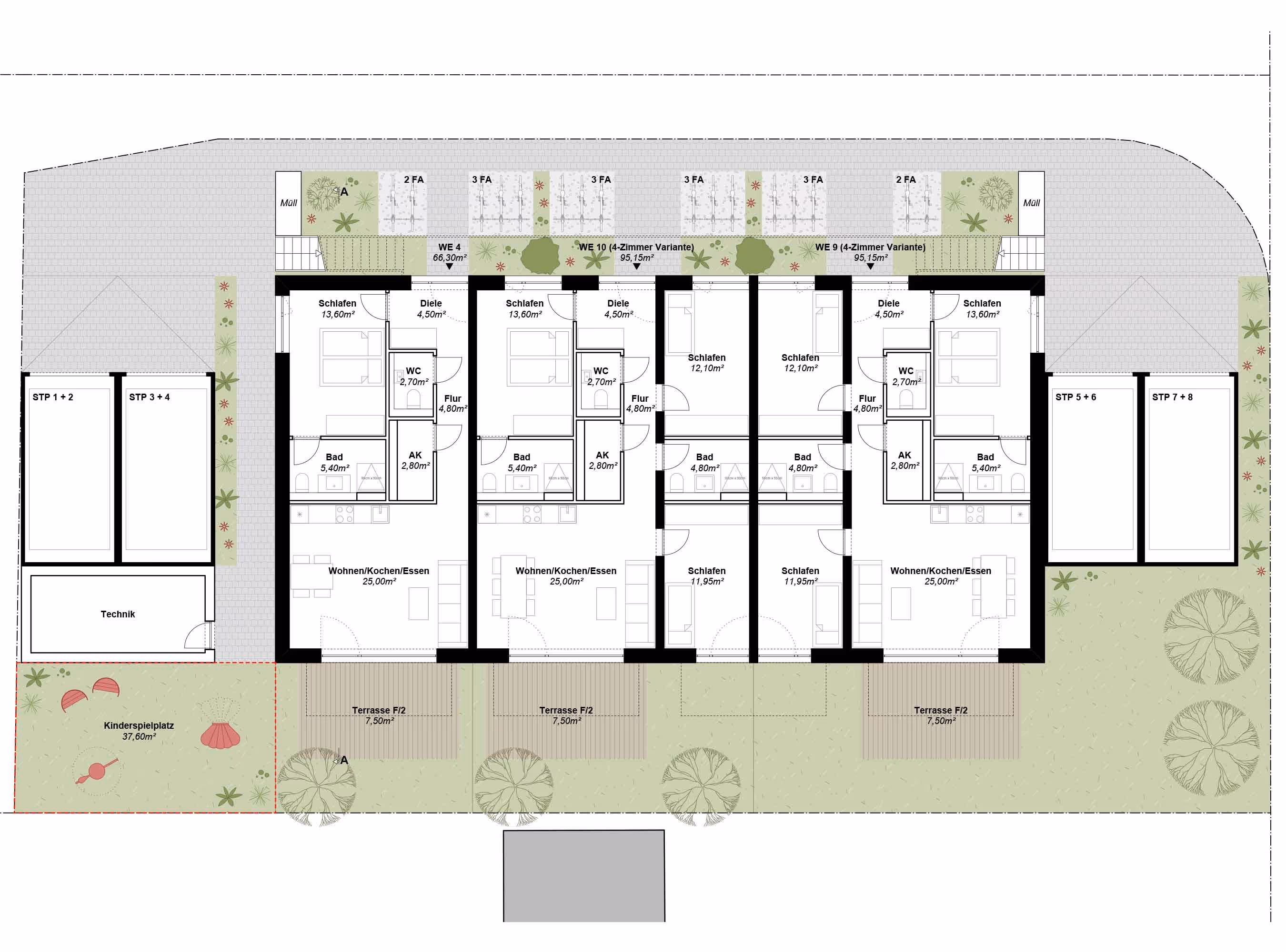 Für Familien ist ein kleiner Kinderspielplatz im Südwesten des Grundstücks angelegt. Praktisch ist der Technikraum bzw. Hausanschlussraum, der sich im Erdgeschoss hinter den Doppelparkergaragen befindet.
